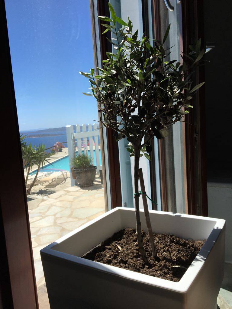 It is on a hill top with a 90 degree view of mountains that can be easily accessed for hiking and 270 degree views of the beautiful blue Aegean.